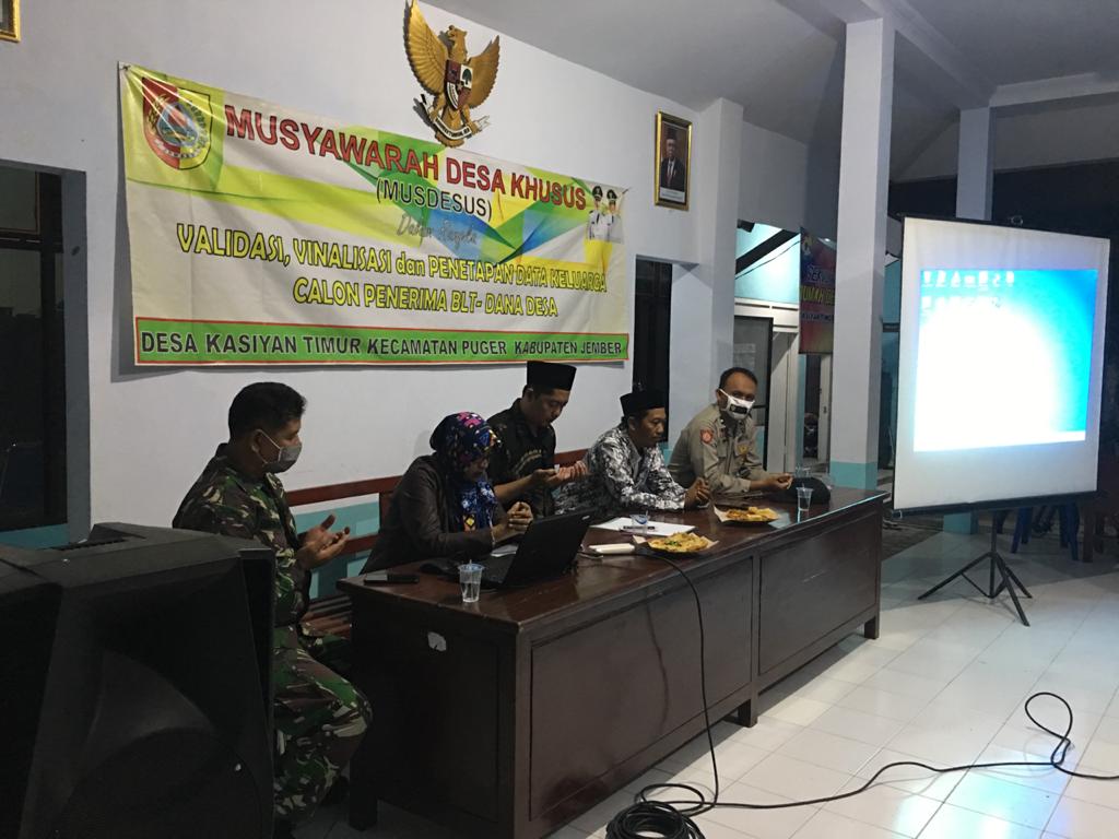 19/04. 20-00 WIB Pemerintah Desa Kasiyan Timur melakukan musywarah Desa khusus ( MUSDESUS) penetapan keluarga penerima manfaat BLT di pendopo kantor Desa Kasiyan Timur, acara tersebut juga dihadiri oleh Pendamping Desa kecamatan dan petugas kecamatan yang diundang sebagai tamu undagan serta RT/RW se Desa Kasiyan Timur, dalam musyawarah tersebut banyak dihujani intruksi dari para RT/RW salah satunya RW 10, Krajan II mengusulkan salah satu warganya untuk masuk dalam penerima BLT karna sudah sesui dengan syarat yang ditetapkan oleh kabupaten, Pungkasnya. dalam proses muyawrah tersebut juga ditampilkan nama nama penerima BLT yang sudah memlalui klasikasi dan validasi dan survey, karna kuota yang terbatas maka para panitia menseleksi secara ketat sehingga diambil 170 sesuai kuota yang diberikan oleh kabupaten, oleh karna itu Panitia yang menyampaikan yang diwakili Oleh BPD yang juga andil dalam tahap seleksi penetapan penerima BLT DD. disela sela musywarah ada kejadian histeris yang mana Bpk Kades Hariyanto menangis karna melihat begitu alotnya proses penetapan KPM BLT DD karna terlalalu bnyaknya intruksi mengenai penetapan KPM BLT, sehingga disela sela Kades kasiyan Timur tersebut menengai bahwa penetapan tersebut sesuai prosedur karna sulit beliau memutuskan karna masih banyak keluarga yang layak yang harusnya menerima bantuan tersebut, apalagi Kades kasiyan timur juga ditekan oleh Bupati untuk segera merealisasikan BLT tersebut kepada KPM terdampak Covid 19 ini pungkasnya,., sehingga setelah penyampaian Kades tersebut para RT/RW memahami sehingga mereka mengikuti mekanisme yang telah dilakukan oleh Panitia sebagai petugas yang dibentuk oleh Kades untuk menyeleksi calon penerima BLT yang bersumber Dana Desa, sebelumnya masyarakat resah tentang akan adanya bantuan BLT dari pemerintah keluarga terdampak Covid 19 yang ada di indonesia salah satunya Desa kasiyan Timur yang mana pasca sebelumnya Bupati penetapkan Kecamatan Puger sebagai Zona Merah, yang ditemukan ada pasien yang berasal dari Kecamatan Puger.