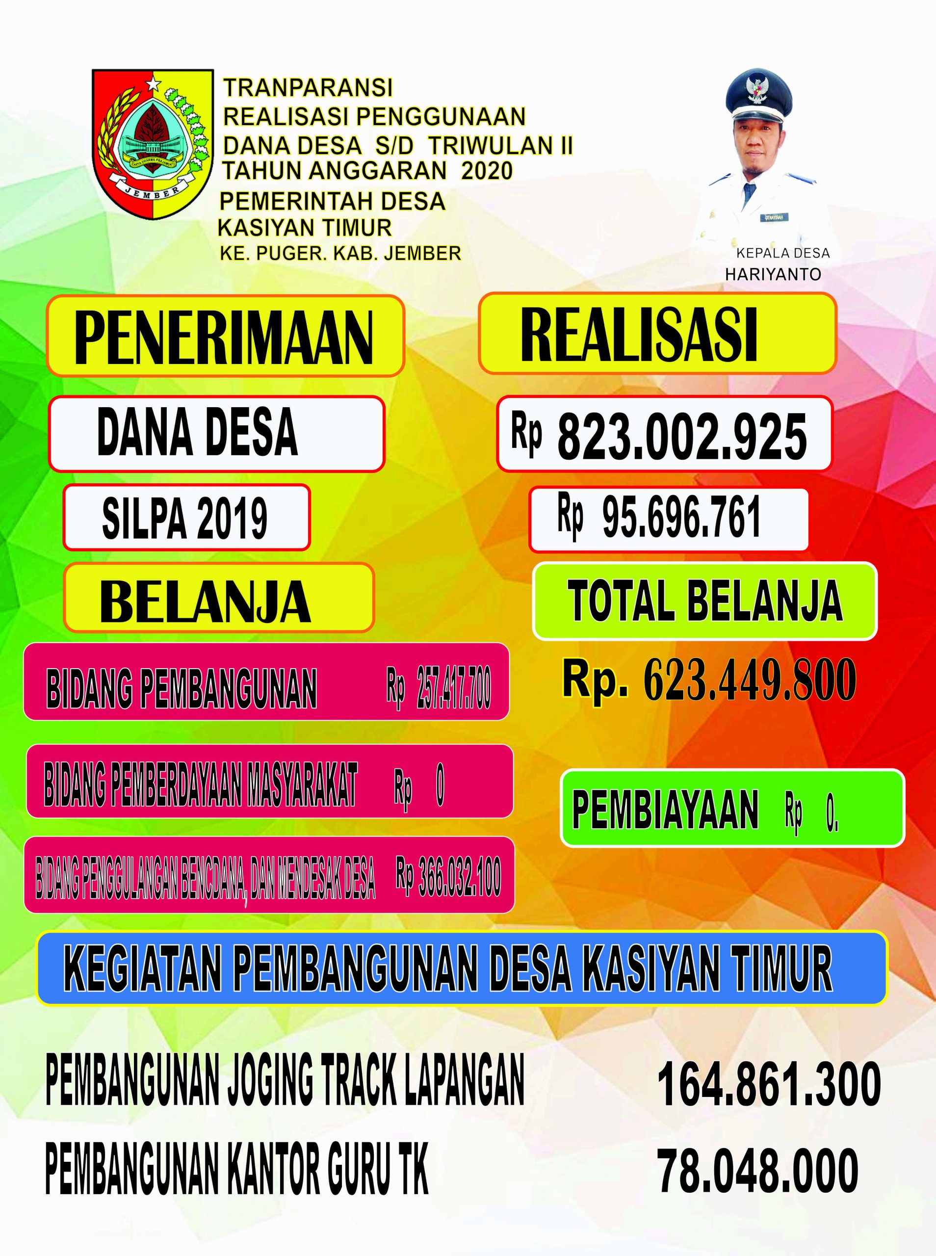 Kabar DesaTranparansi Realisasi Dana Desa 2020 Desa Kasiyan TimurPenulis Operator Desa - Agustus 5, 202001537FacebookTwitterPinterestWhatsApp Bentuk Tranparansi Penggunaan Dana Desa 2020 Desa Kasiyan Timur Kecamatan Puger Kabupaten Jember, sampai dengan Bulan Juni ( Triwulan II ) sbb.